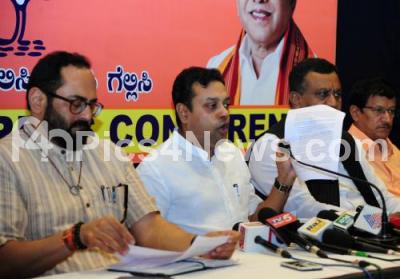 Photo Caption : BJP leader, Sambit Patra with MP Rajeev Chandrashekhar and others addressing a press conference at BJP Media Centre, Malleshwaram, in Bengaluru on Thursday 3rd May 2018