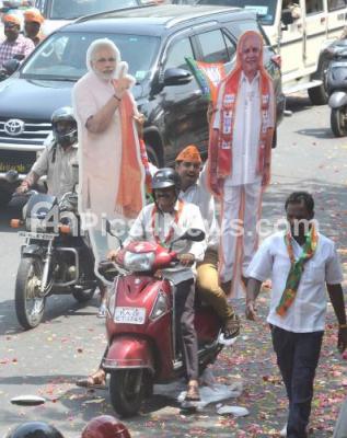 Cutouts of PM Narendra Modi and State President BS Yeddyurappa , Amit Shah and Ananth Kumar being kept at roadside during Union Home Minister Rajnath Singh election campaign at Chickpet Assembly constituency, in Bengaluru on Sunday 6th May 2018