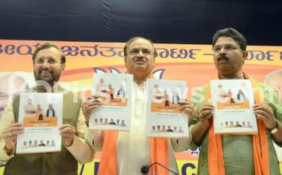 Photo Caption : Union Ministers, Prakash Javedekar and Ananth Kumar with MLA Ashok releasing party manifesto for Bengaluru for the assembly election at BJP Media Centre, in Bengaluru on Tuesday 8th May 2018
