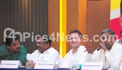 Photo Caption : AICC President, Rahul Gandhi addressing press conference with Chief Minister of Karnataka, Siddaramaiah and KPCC President Dr G Parameshwara at a hotel, in Bengaluru on Thursday 10th May 2018
