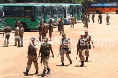Photo Caption : Election Duty busses being parked ahead of the Karnataka Assembly Elections at Malleshwaram Government College, near Freedom Park, in Bengaluru on Friday 11th May 2018