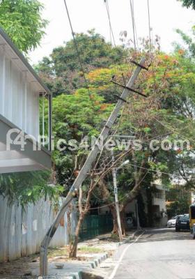 Photo Caption : Electrical pole bending at Sadashivanagar due to last night heavy rains in the city, in Bengaluru on Saturday 12th May 2018