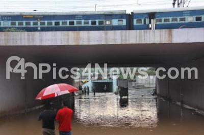 Photo Caption : Rain water logged at the Okalipuram under pass after heavy rain in the city, in Bengaluru on Monday 14th May 2018