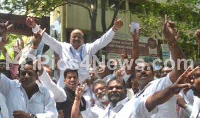 Photo Caption : Congress candidate from Shivajinagar Roshan Baig celebrate after winning 2018 assembly elections, in Bengaluru on Tuesday 15th May 2018