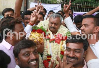 Photo Caption : Congress Yeshwanthpur MLA candidate ST Somashekar celebrates after winning 2018 assembly elections, in Bengaluru on Tuesday 15th May 2018