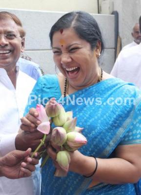 Event Description : BJP MLC Tara seen with lotus flowers at BJP office, in Bengaluru on Wednesday 16th May 2018