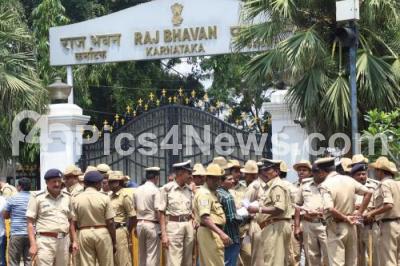 Photo Caption : Police security outside Raj Bhavan, in Bengaluru on Wednesday 16th May 2018