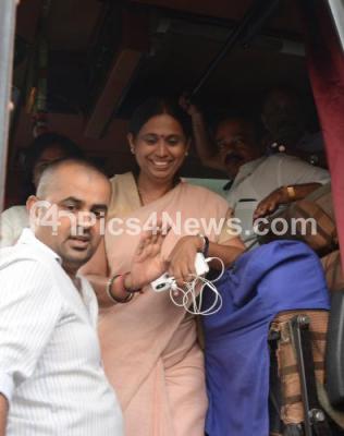 Photo Caption : Congress MLA Lakshmi Hebbalkar going to resort in the bus which came to pick up the Congress MLAs at Congress office, in Bengaluru on Wednesday 16th May 2018
