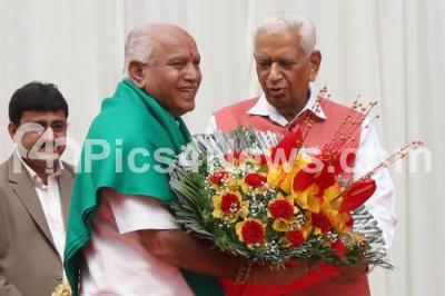 Photo Caption : Newly elected Chief Minister of Karnataka BS Yeddyurappa being greeted by Governor of Karnataka Vajubhai Vala during the swearing ceremony at Raj Bhavan, in Bengaluru on Thursday 17th May 2018 Pics: www.pics4news.com