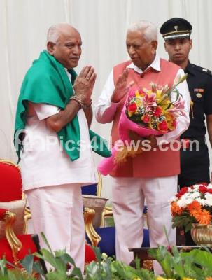 Photo Caption : Newly elected Chief Minister of Karnataka BS Yeddyurappa being greeted by Governor of Karnataka Vajubhai Vala during the swearing ceremony at Raj Bhavan, in Bengaluru on Thursday 17th May 2018 Pics: www.pics4news.com