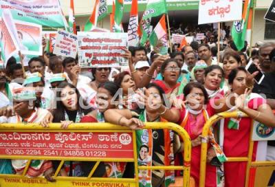Photo Caption : Congress party workers marching towards Raj Bhavan during a protest against Karnataka Governor Vajubhai Vala decision to invite the BJP to form government, the police successfully stopped the protestors at Ambedkar Vedhi, in Bengaluru on Friday 18th May 2018
