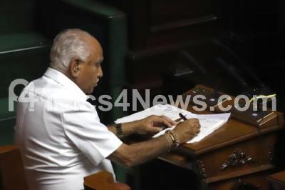 Photo Caption : Chief Minister of Karnataka B S Yeddyurappa seen at Assembly hall, Vidhana Soudha, following vote of confidence of Chief Minister B S Yeddyurappa, in Bengaluru on Saturday 19th May 2018