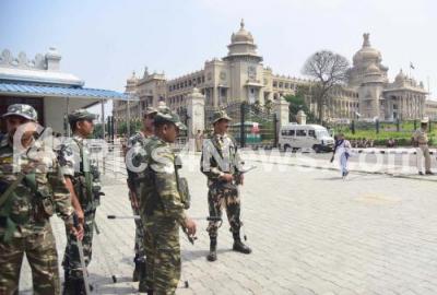 Photo Caption : CISF personnel patrolling around the Vidhana Soudha premises following vote of confidence of Chief Minister B S Yeddyurappa at Vidhana Soudha, in Bengaluru on Saturday 19th May 2018