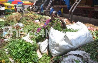 Photo Caption : A vegetable vendor seen selling vegetables in the middle of the garbage at KR Market, in Bengaluru on Sunday 20th May 2018