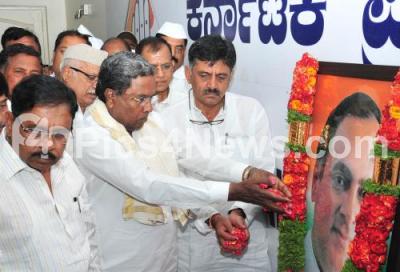 Photo Caption : Congress leaders Siddaramaiah, DK Shivakumar, Dr G Parameshwar and others tribute to Former PM of India Rajiv Gandhi, on the occasion of 27th Death Anniversary at KPCC Office, in Bengaluru on Monday 21st May 2018