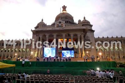 Photo Caption : Vidhana Soudha is all lit up during the preparation work for the upcoming Karnataka Chief Minister swearing ceremony in front of Vidhana Soudha which will be held tomorrow, in Bengaluru on Tuesday 22nd May 2018