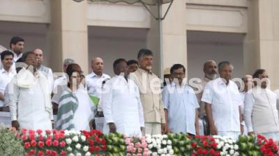 Photo Caption : Former CM of Karnataka Siddaramaiah with Mamata Banerjee, Chief Minister of West Bengal, V Narayanasamy, Chief minister of Puducherry, N. Chandrababu Naidu, Chief Minister of Andhra Pradesh, Arvind Kejriwal, Chief Minister of Delhi, Pinarayi Vijayan and Sharad Yadav, Former Member of Rajya Sabha and others at Vidhana Soudha during swearing in ceremony of JDS chief minister designate HD Kumarswamy and Congress alliance, in Bengaluru on Wednesday 23rd May 2018