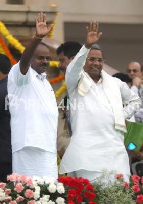 Photo Caption : H D Kumarswamy newly elected Chief Minister of Karnataka and Former CM of Karnataka Siddaramaiah at Vidhana Soudha during swearing in ceremony of JDS chief minister designate HD Kumarswamy and Congress alliance, in Bengaluru on Wednesday 23rd May 2018