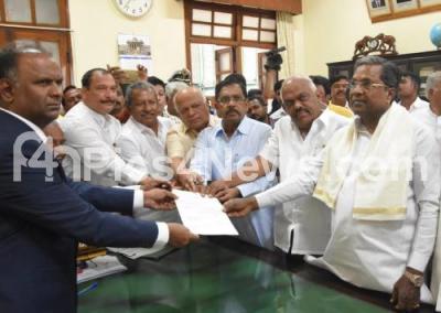 Photo Caption : MLA Ramesh Kumar filing his nomination papers for the post of speaker of Assembly to returning officer S Murthy, Secretary, Legislative Assembly, in the presence of Dr G Parameshwar, Deputy CM, Former CM Siddaramaiah and other Congress leaders at Vidhan Soudha, in Bengaluru on Thursday 24th May 2018