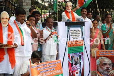 Photo Caption : Congress workers staged a protest against the Central government and highlighting the failures of the government, on the completion of 4 years in the government, the protest was held at Anand Rao Circle, in Bengaluru on Saturday 26th May 2018