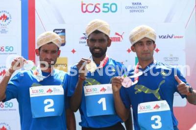 Photo Caption : Top three Indians Winner (C) Suresh Kumar, 1st runner up (L) Man Singh and 2nd runner up (R) Shankar Man Thapa in National Elite Men category during TCS World 10K Bengaluru Run, in Bengaluru on Sunday 27th May 2018