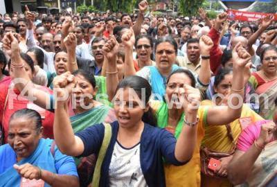 Photo Caption : Bank employees shout slogans as they hold a demonstration as part of the 2 day nationwide strike to press for wage revision, in Bengaluru on Wednesday 30th May 2018