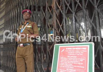 Photo Caption : Security guards stands close to the entrance gate of a bank, as employees went on 2 day nationwide strike to press for wage revision, in Bengaluru on Wednesday 30th May 2018