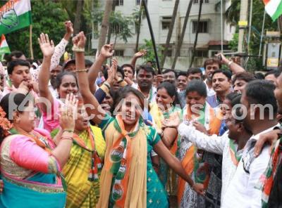 Photo Caption : Supporters of Rajarajeshwari Nagar Congress Candidate Muniratna seen celebrating after the Assembly Election results were announced at Rajarajeshwari Nagar , in Bengaluru on Thursday 31st May 2018