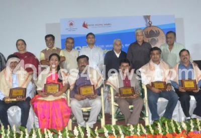 Dr Chandrashekhar Kambar with Dr PS Harsha, IPS, Dr SG Siddaramaiah, Dr Hamsalekha, SV Rajendra Singh Babu and others felicitated the National Film Awardees NR Nanjundegowda, AS Puttaraju, Kavitha Raj, Abahaya Simha, Nityananda Pai and JM Prahalad at Chamundeshwari Studio, organised by Karnataka Film Academy, in Bengaluru on Saturday 2nd June 2018