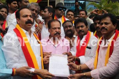 Photo Caption : Members of Karnataka Rakshana Vedike presenting a memorandum to Sa Ra Govind, President Karnataka Film Chamber during their protest against the release of Rajinikanth and Tamil movie “Kaala†in Karnataka theatres, the protest was held in front Karnataka Film Chamber Office, in Bengaluru on Saturday 2nd June 2018