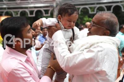 Photo Caption : Newly inducted Minister GT Devegowda seen with his grandchild during Ministers swearing ceremony at Raj Bhavan, in Bengaluru on Wednesday 6th June 2018