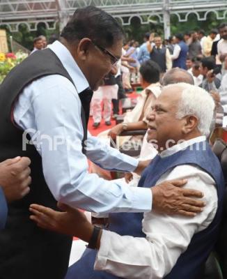 Photo Caption : Newly inducted Minister RV Deshpande and Dy CM Dr G Parameshwara seen during Ministers swearing ceremony at Raj Bhavan, in Bengaluru on Wednesday 6th June 2018