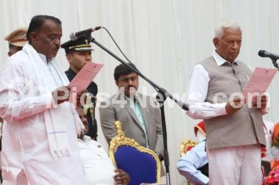 Photo Caption : Governor of Karnataka Vajubhai Vala administering oath to Venkataramanappa during newly inducted Ministers swearing ceremony at Raj Bhavan, in Bengaluru on Wednesday 6th June 2018