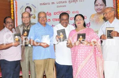 Photo Caption : Padmabhushana Senior Actress Dr B Sarojadevi with Film Director S K Bhagavan, Writer Dr B L Venu Poet Dr H S Venkatesh Murthy, Music Director Hamsalekha, Baraguru Ramachandrappa releasing a book during presentation of "Baraguru†award presentation programme organised by Nadoja Dr Baraguru Foundation at Kannada Sahitya Parishat, in Bengaluru on Sunday 10th June 2018