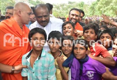 Photo Caption : CM HD Kumarswamy seen with Sri Nirmalananda Swami of Adichunchanagiri Mutt and children during his visit to Adichunchanagiri Mutt at Adichunchanagiri Mutt in Vijayanagar, in Bengaluru on Wednesday 13th June 2018