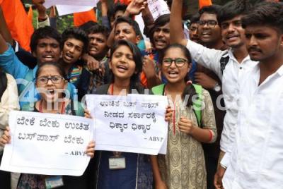 Photo Caption : Members of ABVP staged a protest, demanding for free bus passes for students at Anand Rao Circle, in Bengaluru on Thursday 14th June 2018