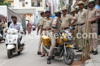 Photo Caption : Tight police security for the byelection of the BBMP in Binnypet ward, in Bengaluru on Monday 18th June 2018