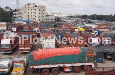Photo Caption : Lorries and Trucks parked near Kanteeva Studio, after the indefinite strike called by lorry owners association against the hike in diesel price and various other demands, in Bengaluru on Monday 18th June 2018