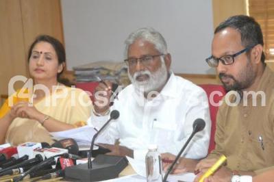 Photo Caption : Minister fir Education N Mahesh with Shalini Rajanish, Principal Secretary to Government Education Department and MT Reju, IAS addressing a meeting at Public Education Dept, in Bengaluru on Tuesday 19th June 2018