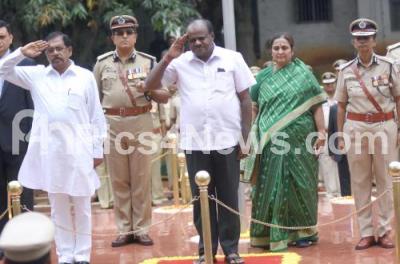 Photo Caption : Chief Minister of Karnataka H D Kumaraswamy with Deputy CM Dr G Parameshwar during a review meeting of Karnataka State senior police officers at DG office, also seen are Chief Secretary Ratna Prabha, Neelamani Raju, DG and IGP , Rajneesh Goyal, Principal secretary Home and others, in Bengaluru on Friday 22nd June 2018