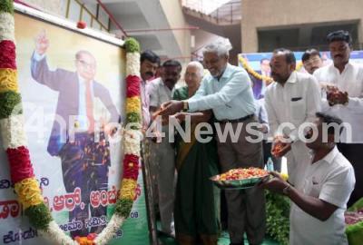 Photo Caption : Former Minister BT Lalita Nayak with B Gopal, President, BMTC SCST welfare association and others offering floral tribute to Dr B R Ambedkar portrait during 127th Jayantostasva of Dr BR Ambedkar, organised by BMTC SCST welfare association at Yeshwanthpura Bus Station, in Bengaluru on Saturday 23rd June 2018