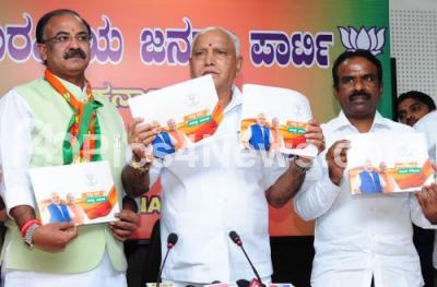 Photo Caption : BJP State President B S Yeddyurappa with MLA Arvind Limbavali and MLC N Ravikumar releasing the BJP Central Govt 4 years achievements “Shudda Nade Sukta Vikas†book at BJP Office, in Bengaluru on Sunday 24th June 2018