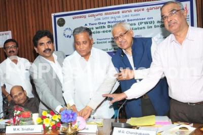 Photo Caption : MLA V Somanna with Prof M G Chandrakanta, Director, ISEC, Prof C M Lakshamana, Prof M K Sridhar and others at the inauguration of two day National Seminar on Persons with Disabilities (PWD) and their Socio Economic Status in India organised by Institute for Social and Economic Change at Nagarabhavi, in Bengaluru on Thursday 28th June 2018