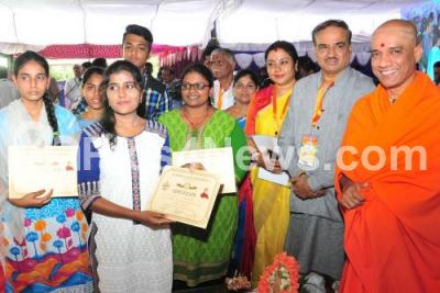 Photo Caption : Sri Nirmalananda Swami of Adichunchanagiri Mutt with Union Minister Ananth Kumar, MLC Tara and others distributing the certificates to students at the 8th year anniversary of Raksha Foundation at Shalini Grounds, Jayanagar, in Bengaluru on Saturday 30th June 2018