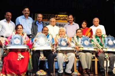 Photo Caption : Jnanapeeta Awardee Dr Chandrashekar Kambar, President, Kendra Sahitya Academy presenting "Maasti" awards to Dr K V Thirumalesh, Dr Siddalinga Shetty, Dr B L Venu, Dr Narahalli Balasubramanya and Prof M R Kamala at a award programme organised by Dr Maasti Venkatesh Iyanger Trust and Kannada and Culture Dept at Bharatiya Vidya Bhavan, also seen are Dr C N Ramachandran, N R Vishukumar, Director, Kannada and Culture Dept, Dr M S Ashadevi and S R Vijaya Shankara and others, in Bengaluru on Sunday 1st July 2018