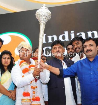 BV Srinivas, Vice President, National Youth Congress being felicitated by Minister DK Shivakumar during his felicitation programme at Palace Grounds, also seen are MLA Sowmya Reddy and others, in Bengaluru on Sunday 1st July 2018