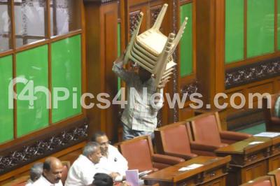 Photo Caption : Worker seen carrying plastic chairs for the MLCs during Joint Session at Vidhana Soudha, in Bengaluru on Monday 2nd July 2018