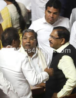 Photo Caption : Deputy CM Dr G Parameshwara seen interacting with Former CM Siddaramaiah and Minister K J George during Joint Session at Vidhana Soudha, in Bengaluru on Monday 2nd July 2018