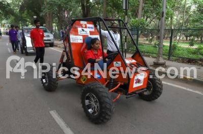 Students from Sairam College of Engineering demonstrating their Bore well rescue robot, an all terrain vehicle, future car, mars rover vehicle and Formula vehicle during their press conference at press club, in Bengaluru on Wednesday 4th July 2018