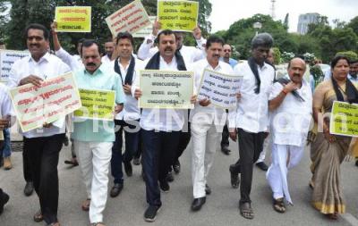 BJP MLAs and MLCs protesting against state Budget for giving more preparation to Hassan, Mandya and Ramanagar districts at Vidhana Soudha, in Bengaluru on Friday 6th July 2018